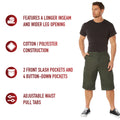 Rothco’s Long Length Battle Dress Uniform (BDU) Shorts feature a longer inseam (13 ½”), a 1” wider leg opening, and a zipper fly closure compared to our standard BDU Shorts. The fatigue shorts are made of a combat-tested cotton / polyester construction for long-lasting wear. The long length shorts are designed with six versatile pockets, including two front slash pockets, two large button-down pleated bellow cargo pockets, and two button-down back pockets. For the ideal fit, use the adjustable pull-tabs at the military shorts’ waist. Available in various camo patterns, including classic woodland camo.