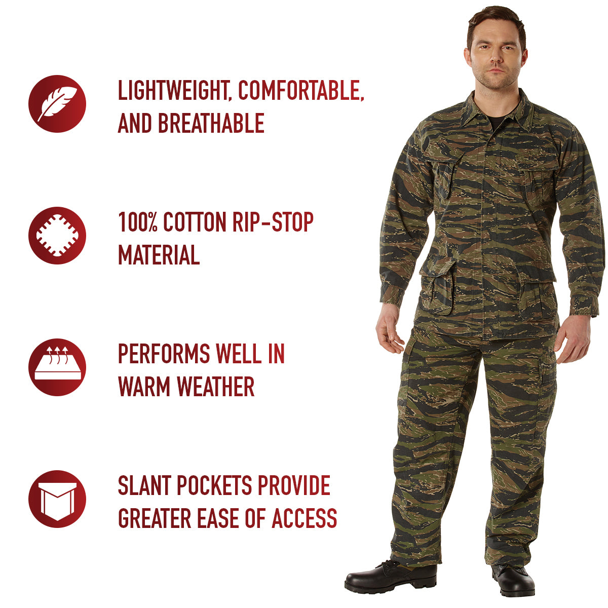 - These breathable fatigues are made of durable, 100% cotton rip-stop material that’ll keep you cool while enduring a day’s worth of work or play.