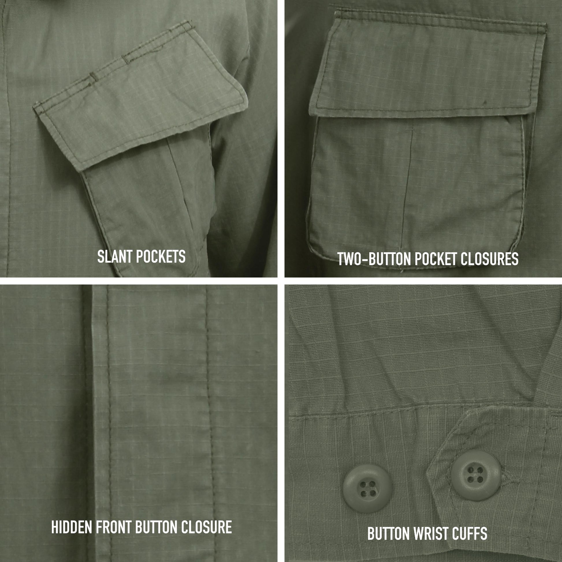 - The shirt’s four authentic Vietnam era slant pockets provide greater ease of access to gear on the opposite side of your body. The pockets also feature a two-button closure that keeps your items safe and secure. They’re perfect for storing your cellphone, wallet, keys, and other essentials.