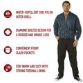 Our Diamond Nylon Quilted Flight Jacket is thermal lined and features a 100% nylon water repellent outer shell. The thermal lining matches the same color as the outer shell and the padding with diamond quilting helps keep you warm. Two front slash pockets help keep gear secure.