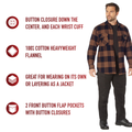 - While sporting two functional front button flap pockets with button closures, our heavyweight 8-ounce fabric shirts feature a six-button closure down the center chest, and a button on each wrist cuff for comfortable all-day (and all-night) wear. Furthermore, both pockets are convenient for holding small, miscellaneous items.