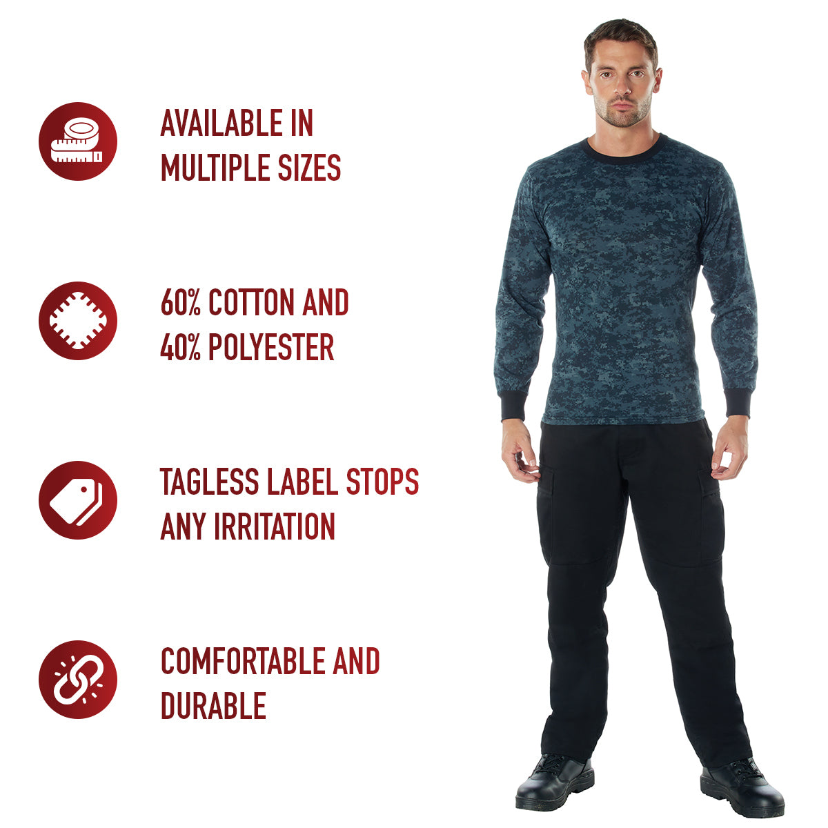Rothco’s Long Sleeve Digital Camo T-Shirt is made of a comfortable and durable 60% cotton/40% polyester material. This long sleeve camouflage shirt is machine washable, has a tagless label for added comfort, and comes in a variety of digital camouflage patterns.