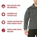 - Each tactical ops jacket provides consistent thermal insulation and warmth with a heavyweight fleece composition and tricot lining. The reinforced shoulder and forearm yokes enhance the jacket’s durability and performance. Along with the mandarin collar for added coverage and protection, these jackets also feature an internal main zipper flap.