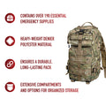 Tactical Choice Plus's Military Trauma Kit contains over 190 important first aid supplies packed into one of our Medium Transport Packs. The heavy weight denier polyester material of the transport pack ensures a durable, long-lasting pack, which can brave the elements. The extensive storage options make the pack ideal for organizing all your first aid supplies. The backpack features one large compartment with a zippered pouch and mesh pocket, 3 additional outside zipper pockets and storage compartment and is also MOLLE compatible. Contents of the Military Trauma Kit include: Bandages and Dressings: 1 6" Elastic Bandage 5 Eye Pads 16 1" x 3" Bandage Strips 5 2" x 9" Abdominal Pads 5 4" x 4" Sterile Gauze 2 Bleed Stop Bandages 2 40" x 40" x 56" Triangle Bandages 5 Butterfly Strips 10 Knuckle Bandages 3 12" x 30" Multi-Trauma Dressings 5 Ammonia Inhalants EMS Equipment & Supplies: 8 Pairs of Examination Gloves 2 Casualty Blankets 84" x 52" Silver/OD 2 1" Tape 2 Ice Packs 5 Tongue Depressors 1 EMT Shears 1 Tweezers 2 Scalpel Blades 1 Latex Tourniquet 1 Stethoscope 2 Sutures 2 Stainless Steel Hemostats 1 #3 Scalpel Handle 2 Air Ways 1 Cervical Collar 1 Pen Light 1 Universal Splint 1 CPR Mask Wound Cleaning/Misc.: 10 Aspirin/Packages of 2 1 6 oz. Calamine Lotion 6 After Bite Wipes 45 Antiseptic Wipes 1 Skin & Eye Wash 5 Burn Aid Packages 1 First Aid Book 6 Safety Pins 1 2oz. Hand Sanitizer 1 Hand Soap 10 Triple Antibiotic Ointment