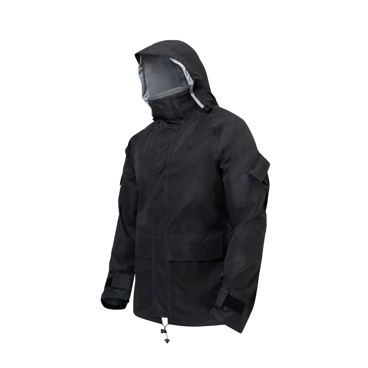 Dominate extreme weather conditions with our lightweight and breathable Tactical Hard Shell Waterproof Jacket. This military jacket is ideal for rugged use with a three-layer composition, a water-resistant material coating, and a three-layer sealing tape that keeps you dry in extreme wet weather. With Six pockets located on the front, biceps, and concealed in the chest of the hard shell jacket that seal with hook-and-loop closures, this rain jacket has plenty of space for storing tactical gear and rations. The windbreaker jacket has a stow-away hood with cinch cord and barrel lock adjusters large enough to fit over most military and tactical helmets, making this tactical hard shell jacket a must-have for inclement weather missions. Hook-and-loop wrist cuffs on the tactical jacket ensure a complete dry seal between your jacket and gloves while the drawstring bottom secures it tightly above your duty belt for easy military and tactical access. The hard shell jacket also comes with underarm zipper vents that enable you to cool down during long, strenuous activities like hiking to your favorite fishing spot. Additionally, a strategically-placed snap-on closure located on the seven-snap storm flap makes it easy to mount badges or insignias on your rain coat.