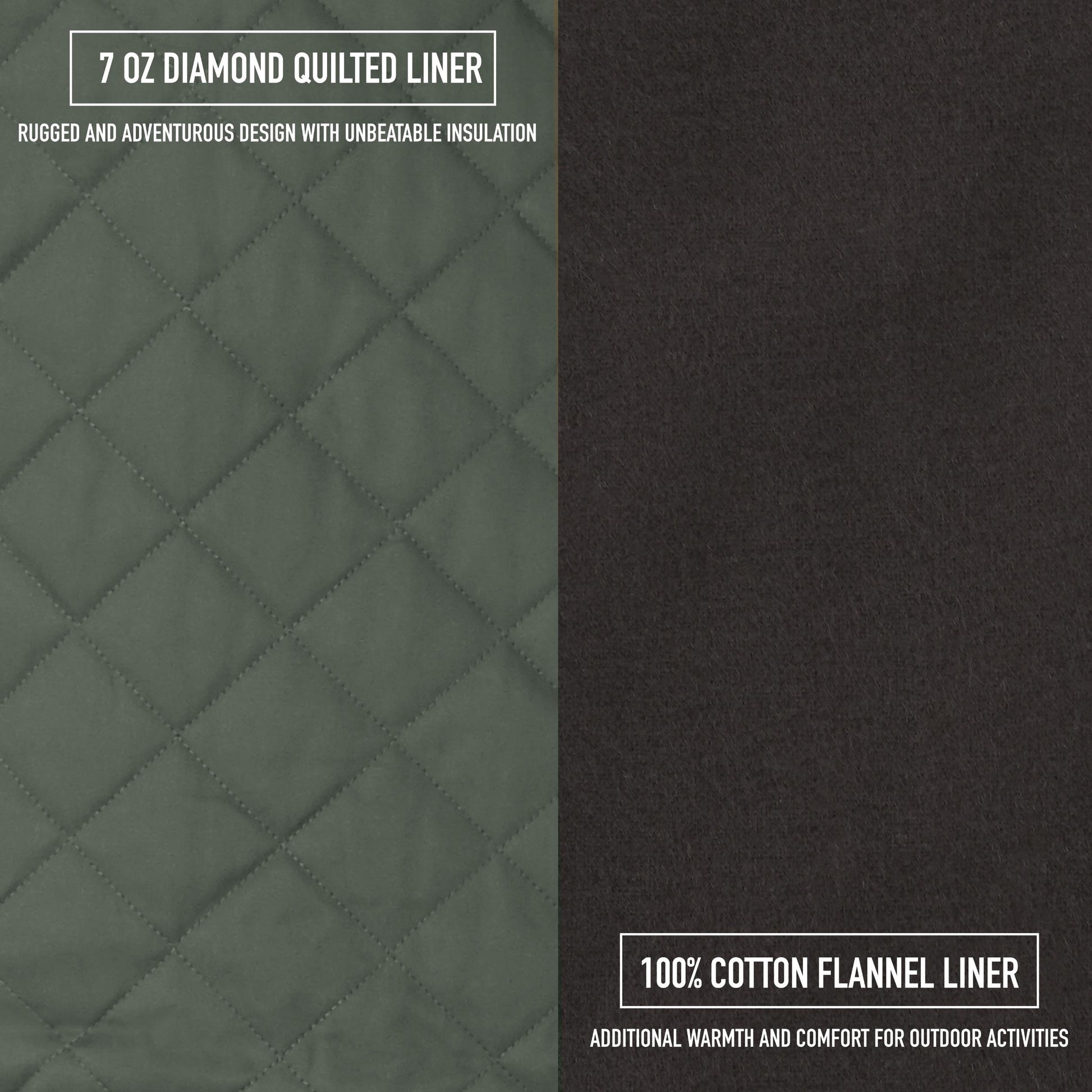 - With stylish 7 OZ diamond quilting, a 100% cotton twill outer shell, a 100% cotton flannel body liner, 100% polyester taffeta sleeve liners, and 3.5 OZ polyester filling, our insulated jackets provide all-day comfort and warmth, no matter the location.