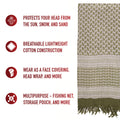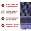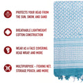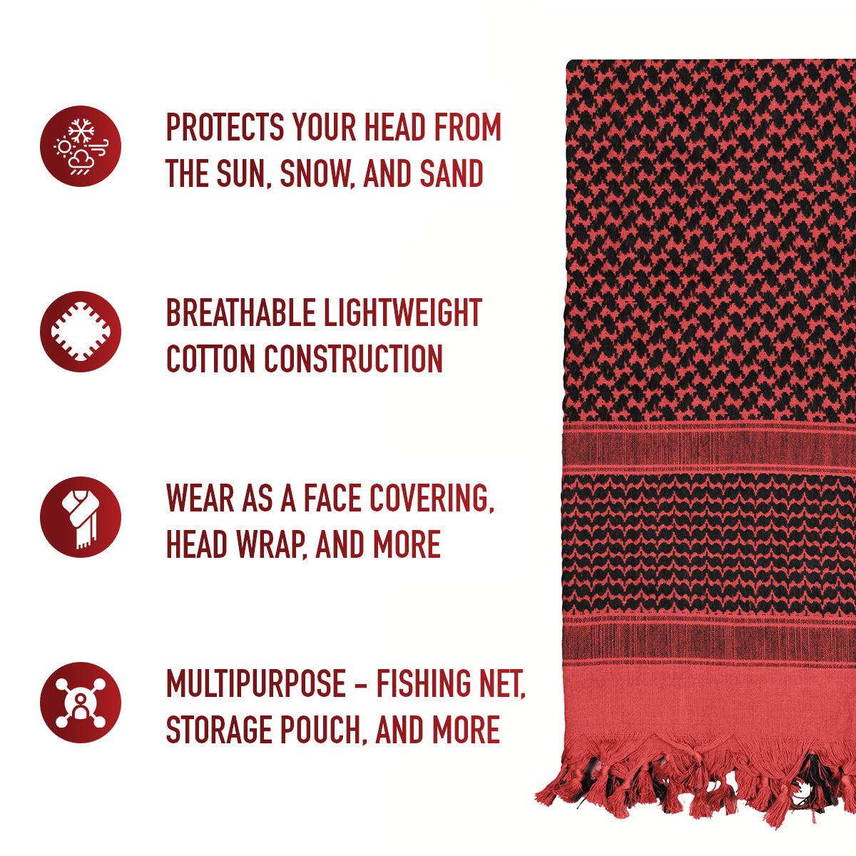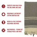 - Made from a breathable lightweight cotton construction, the keffiyeh provides a perfect combination of comfort and resiliency while protecting your head and neck from the sun, dirt, sand, and other debris.