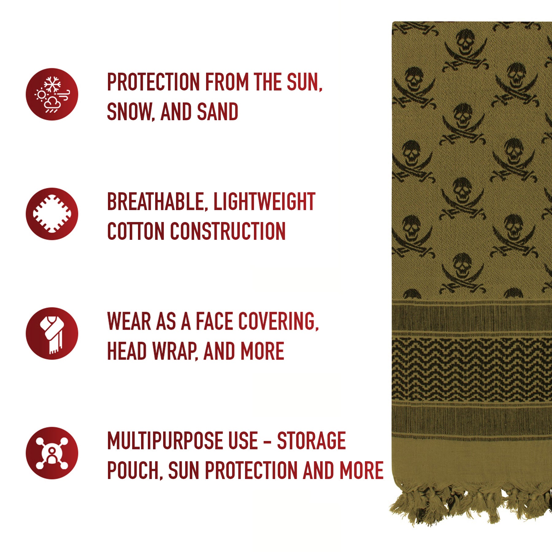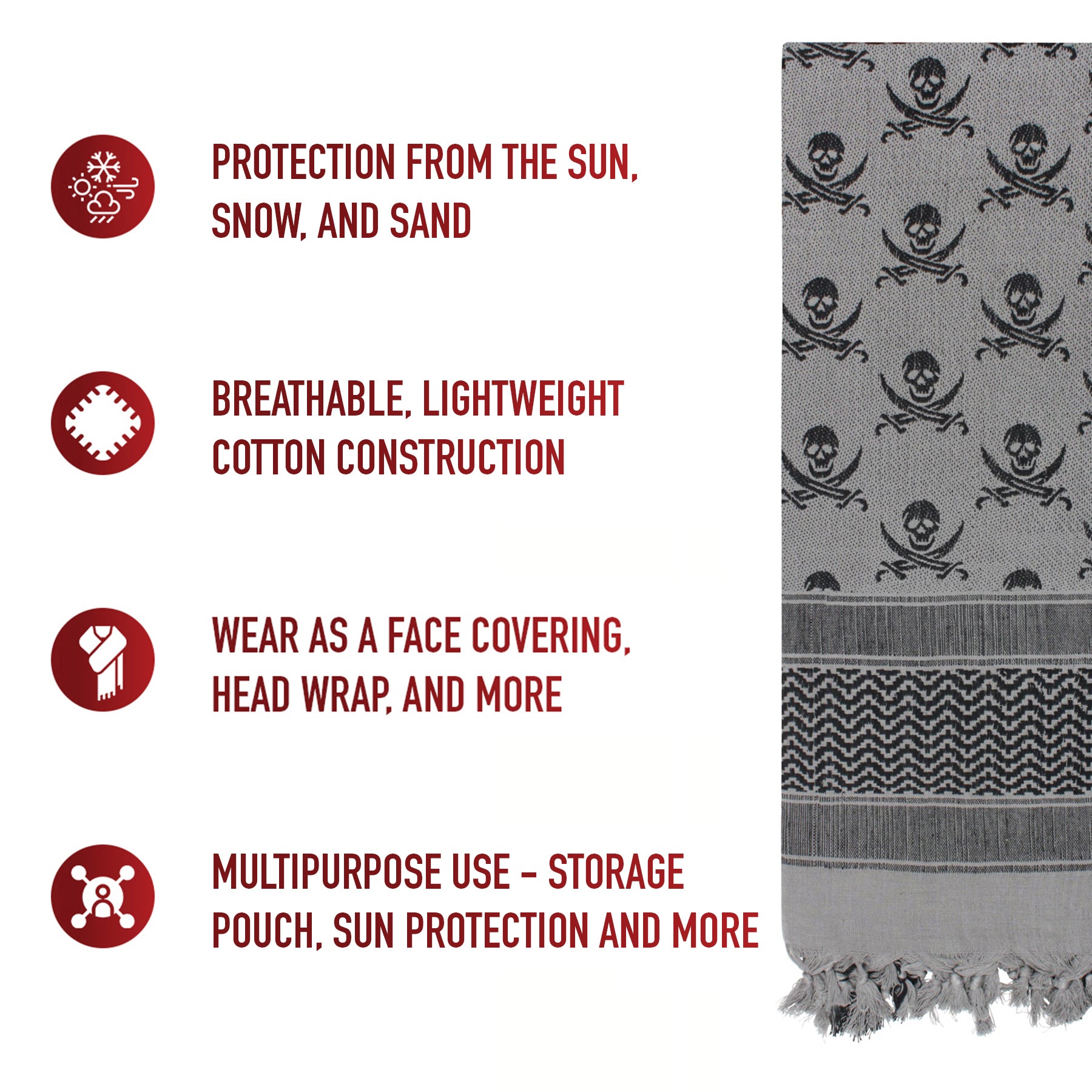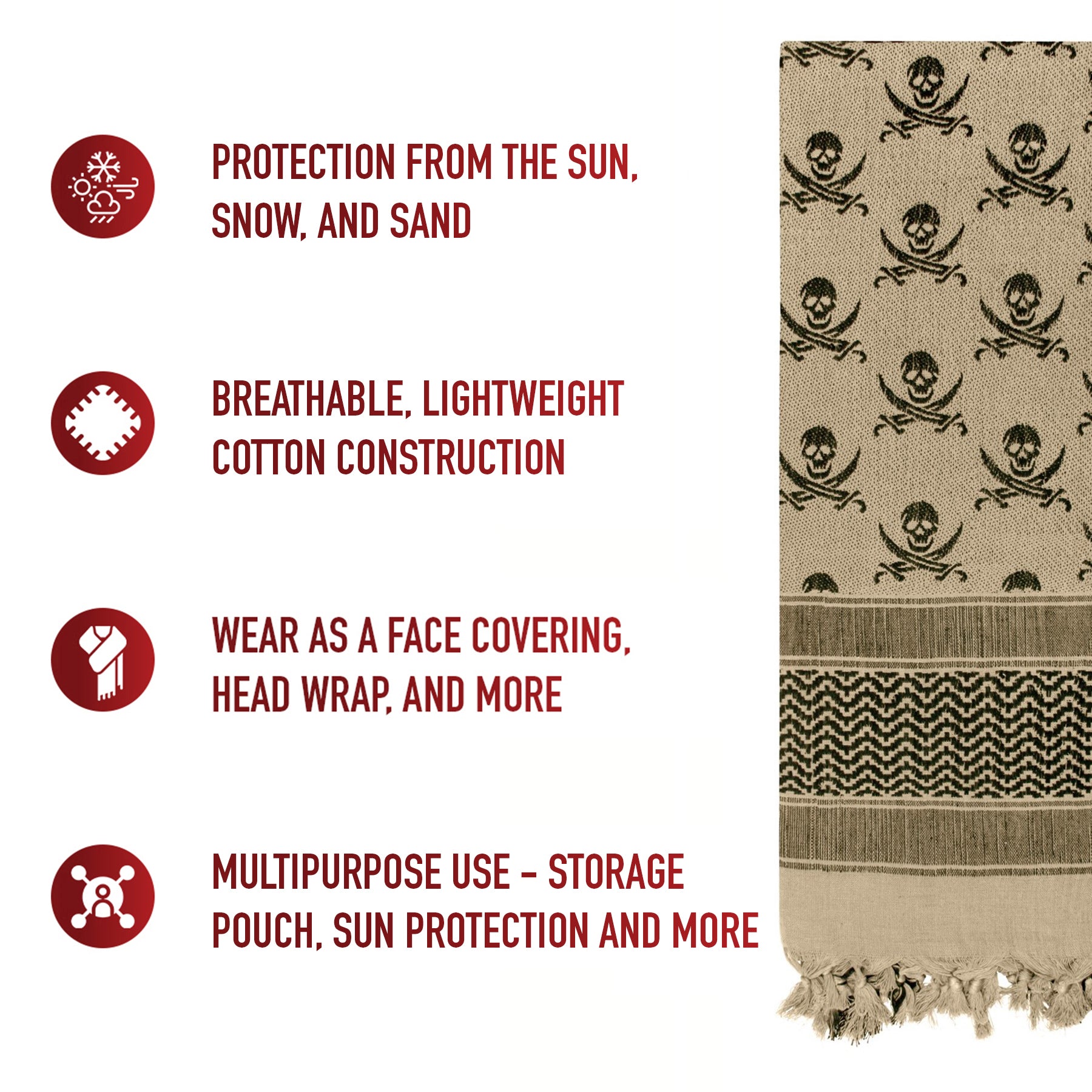 Worn while traveling through a desert, snowstorm, and any other extreme weather conditions, Tactical Choice Plus’s Skulls Shemagh Keffiyeh Scarves are adaptable to any environment. Great as a face mask, neck gaiter, headwrap, and much more! Made from a breathable woven cotton construction, the skull keffiyeh provides a perfect combination of comfort and resiliency while protecting your head and neck from the sun, dirt, sand, and other debris. Measuring approximately 42” X 42”, the tactical scarf can be wrapped around your head and neck to make a face mask, half-mask, skullcap, and much more. The versatile skull keffiyeh is a must-have for your Bug Out Bag as it can be used as a survival tool as well as a protective face cover; use the skull shemagh to make a makeshift tourniquet, sling, pouch, and more. Available in a variety of colors, the tactical desert scarves are used by military personnel worldwide and make for a great fashion accessory as well.